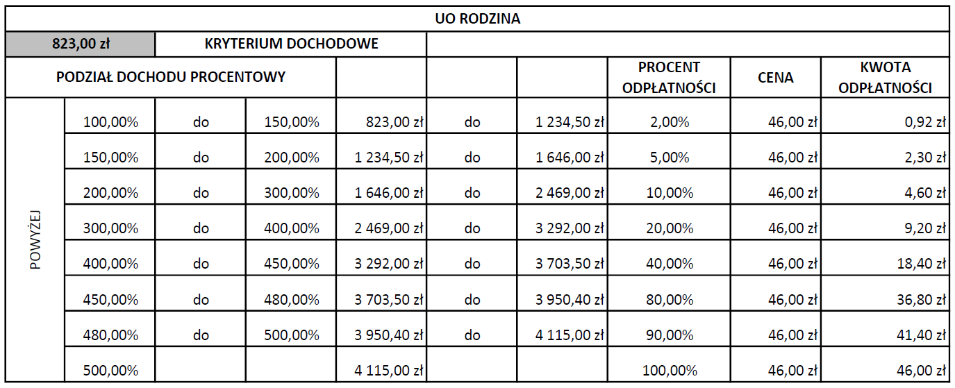 - kryterium dochodowe dla osoby w rodzinie – kwoty 823 zł